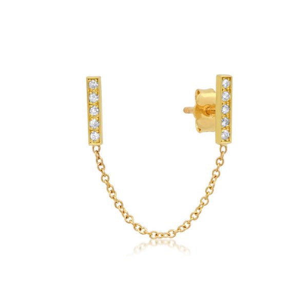 Handcrafted in 18-karat yellow gold, this edgier stud features two diamond bar studs connected by a delicate chain that hangs below the ear lobe to link them together. An update on one of our signature pieces, we love the earring worn alone or stacked with other studs from the collection.