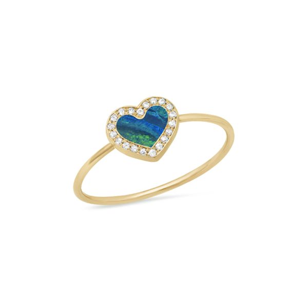Handcrafted in polished 18-karat yellow gold, our extra small inlay heart ring features a heart cut opal stone framed with shimmering pave diamonds and set in the middle of the band. A sweet gift for yourself or someone special, we love this ring worn alone or stacked with others from the collection.
