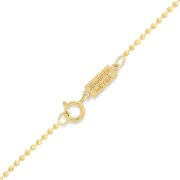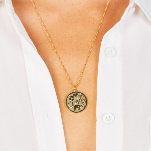 Our signature Good Luck Necklace is handcrafted in 18-karat yellow gold and the charm hangs from a 20″ diamond cut gold bead chain. A timeless necklace that is iconic to our brand, the good luck charm is comprised of seven good luck symbols – an elephant, evil eye with diamond detail, Om, horseshoe with diamond detail, four leaf clover and a heart – a wear-forever piece to bring you good fortune.