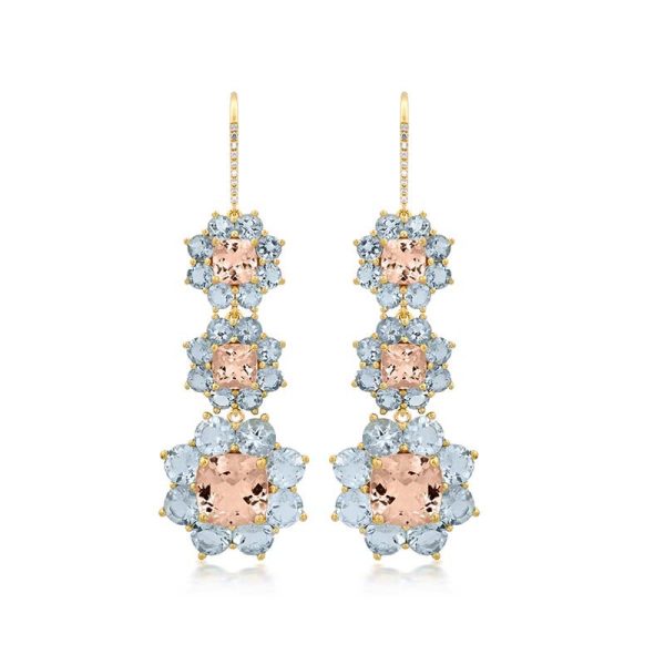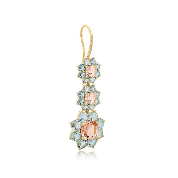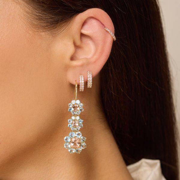 Our Graduated Small Aquamarine & Morganite Flower Earrings featuring three charming blooms – two flowers cascading to a larger blossom at the bottom. Each flower showcases a Morganite gemstone at its center, with petals in soft hued Aquamarine stones. Suspended from an ear wire adorned with diamond pave, these earrings add a touch of elegance to your style.