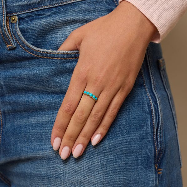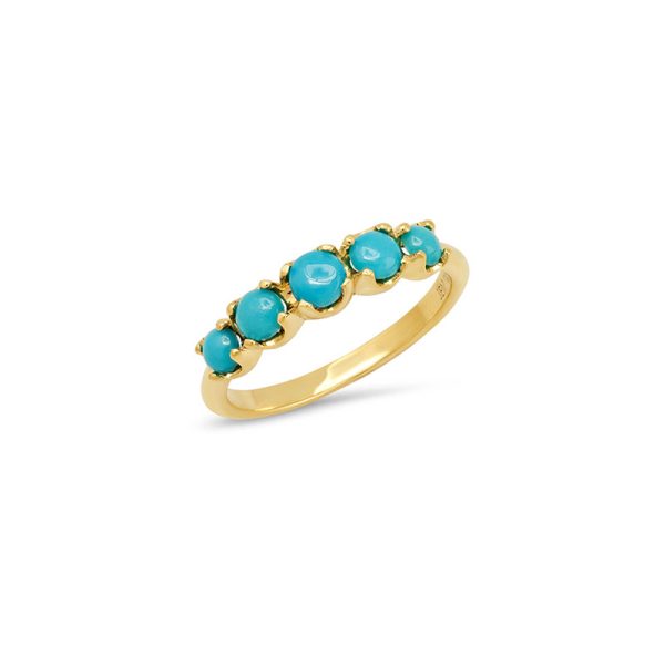 Handcrafted in 18-karat yellow gold, our Graduated Turquoise Ring features 0.68 carats of turquoise cabochons in varying sizes set in a four prong setting. With the largest turquoise set in the center and framed by slightly smaller stones, this ring is a true classic with wear forever appeal.