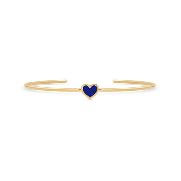 An extra small lapis inlay heart is set on a polished 18-karat yellow gold cuff. An everyday accessory, we love the bracelet worn on its own or stacked with others from the collection. A symbol of love, it’s the perfect gift for someone special.