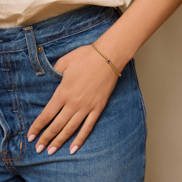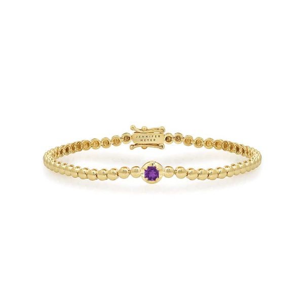 Crafted in 18-karat yellow gold, this Mini Bezel Tennis Bracelet is accented with an illusion set Amethyst at the center. One of our favorite bracelets, it makes a stunning statement when worn alone or layered with other pieces from our collection. Wear yours as a signature piece, day to night and everywhere in between.