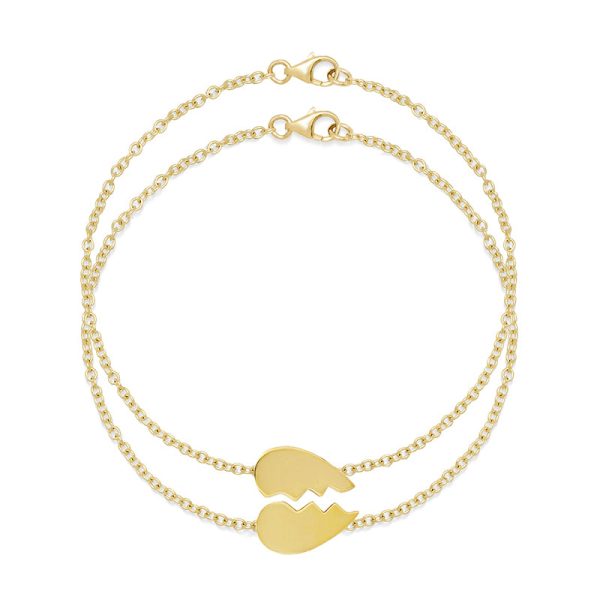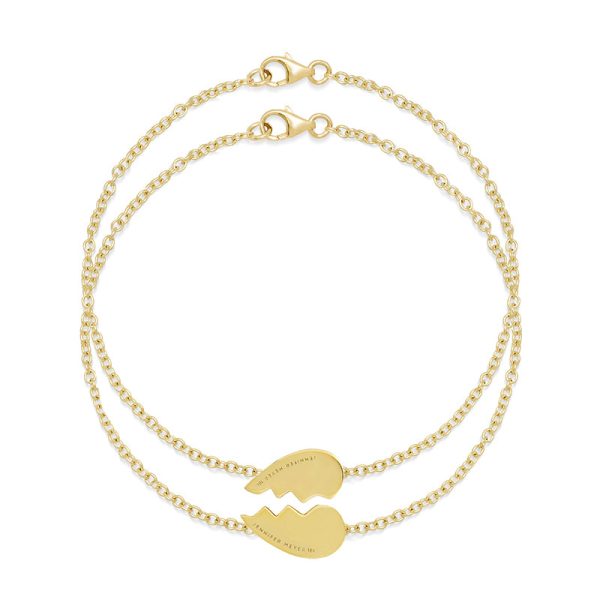 What better way to say, “ILY” then with a nostalgic set of matching friendship bracelets. Handcrafted in elevated 18 karat gold twist, our Mini Piece of My Heart Bracelet set offers two bracelets, one for you and your nearest/dearest to share the beloved kinship of super cute jewelry. Each side features a solid 18 karat gold heart half on a 14 karat gold link chain.