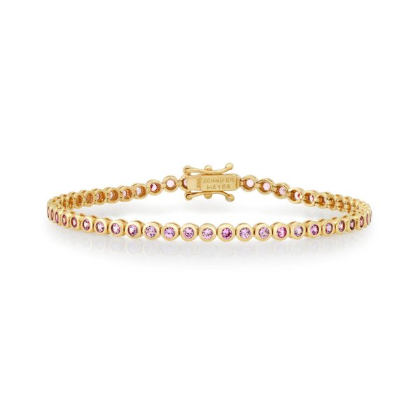 Handcrafted in polished 18-karat yellow gold, our mini bezel tennis bracelet is set with 2.20 carats of round, brilliant-cut pink sapphire. A welcome addition to your everyday, wear the classic bracelet alone or stacked with others from the collection.