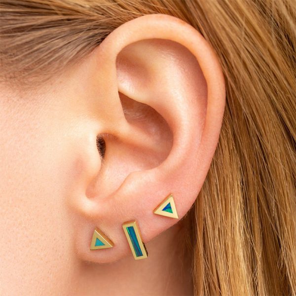 Handcrafted in 18-karat yellow gold, this triangle stud is set with opal inlay to add a pop of color to your everyday. Take your styling cue from Jen and wear with others from the collection.