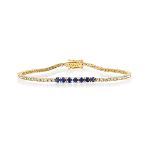 A true classic, our Diamond Four Prong Tennis Bracelet is accented with larger four prong set blue sapphires at the center. Handcrafted in 18-karat yellow gold and set with 1.50 carats of round, brilliant-cut white diamonds this bracelet has timeless appeal – the perfect gift for yourself or someone you love, because diamonds are always a good idea!