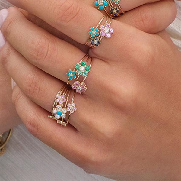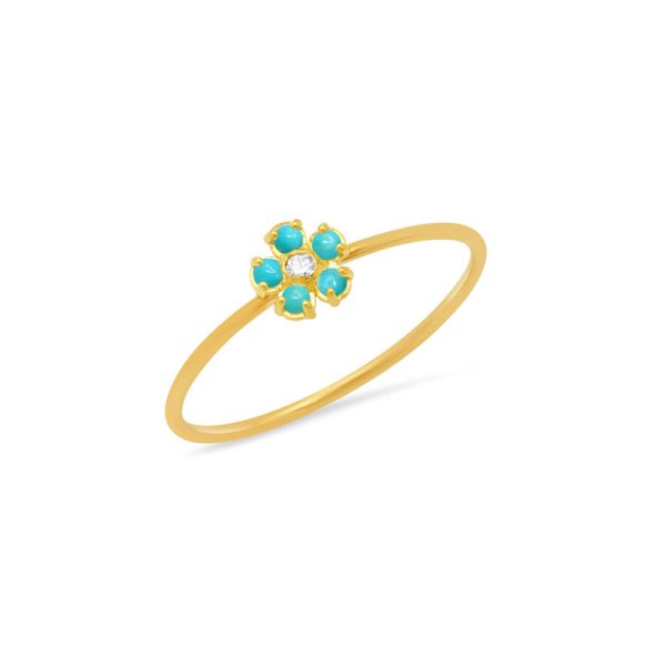 Handcrafted in 18-karat yellow gold, our mini flower ring features a white diamond center surrounded by a ring of turquoise cabochons, set on a thin yellow gold band. A sweet gift for yourself or someone special, we love this ring worn alone or stacked with others from the collection.