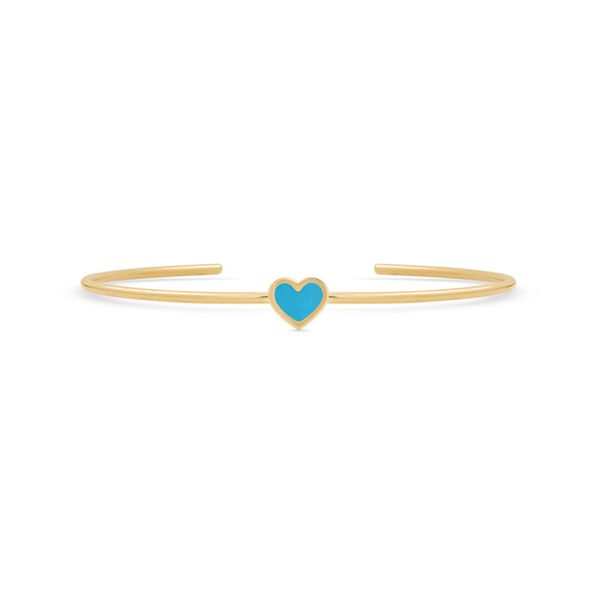 An extra small turquoise inlay heart is set on a polished 18-karat yellow gold cuff. An everyday accessory, we love the bracelet worn on its own or stacked with others from the collection. A symbol of love, it’s the perfect gift for someone special.